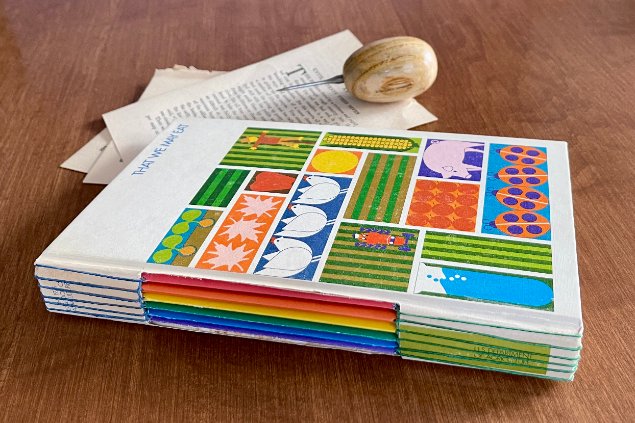Breathe new life into an old book while learning a bookbinding technique that is also a sustainability tool. The hardback cover of your book will remain, but hand-bound sets of blank pages (signatures) with patterned cardstock covers will replace the original text. There will be ideas for incorporating some of those leftover original pages back into your design, and different ways to alter the cover.
